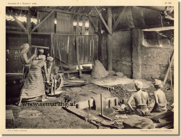 Hetzelfde deel der smidse, als op Plaat I is afgebeeld, maar waar thans de „gong", door den „pandji" met twee nijptangen vastgehouden, op den „watoe tanděs" door vier smeden met hunne „paloe's" wordt gesmeed.