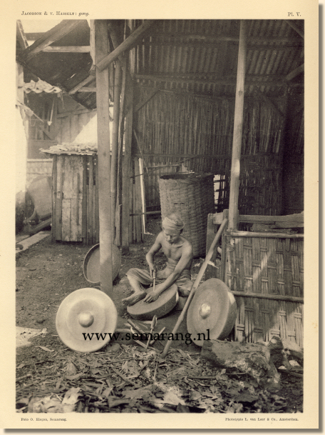 Terwijl de „gong" gedeeltelijk steunt in een ondiepen kuil in den grond, vijlt de man den knop glad met de groffe, gebogen vijl „platar". Voor hem op den grond ligt een stel van de verschillende werktuigen, die hjj gebruikt: in het midden de „platar", links daarvan de „pěngěsiq", het aan een kort dwarshout bevestigd sikkelvormig schaafmes, en rechts de korte „oeriq" waarmede de tanden van de vijl gescherpt worden. Ter rechterzijde staat, tegen een paal aangeleund, de „pangoer", de lange stok, waarin een klein beitelvormig ijzer is bevestigd, om de „gong" af te schaven, en links op den voorgrond ziet men een „gong" waarvan het geheele bovenvlak glimmend gevijld is.